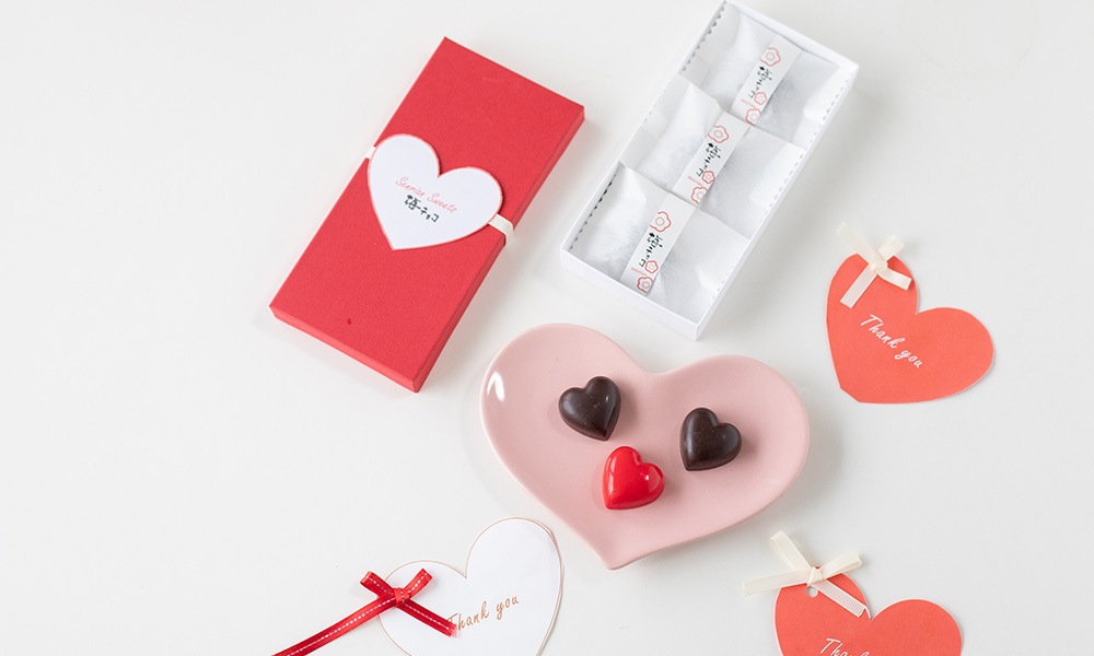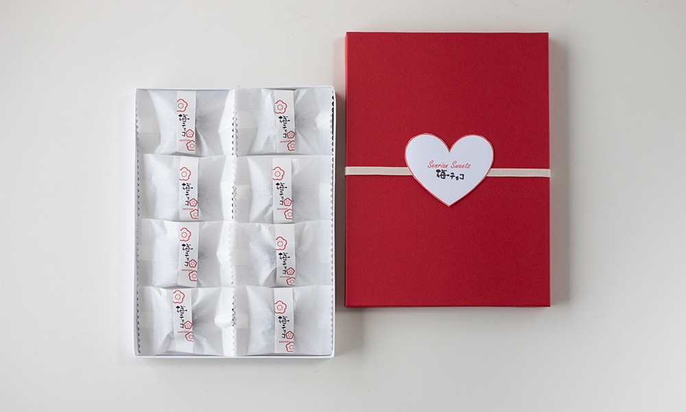 紀州種抜き南高梅を使っています。少しビターなブラックチョコでコーティング。そとはサクッと中は柔らかクリームの2層チョコです。