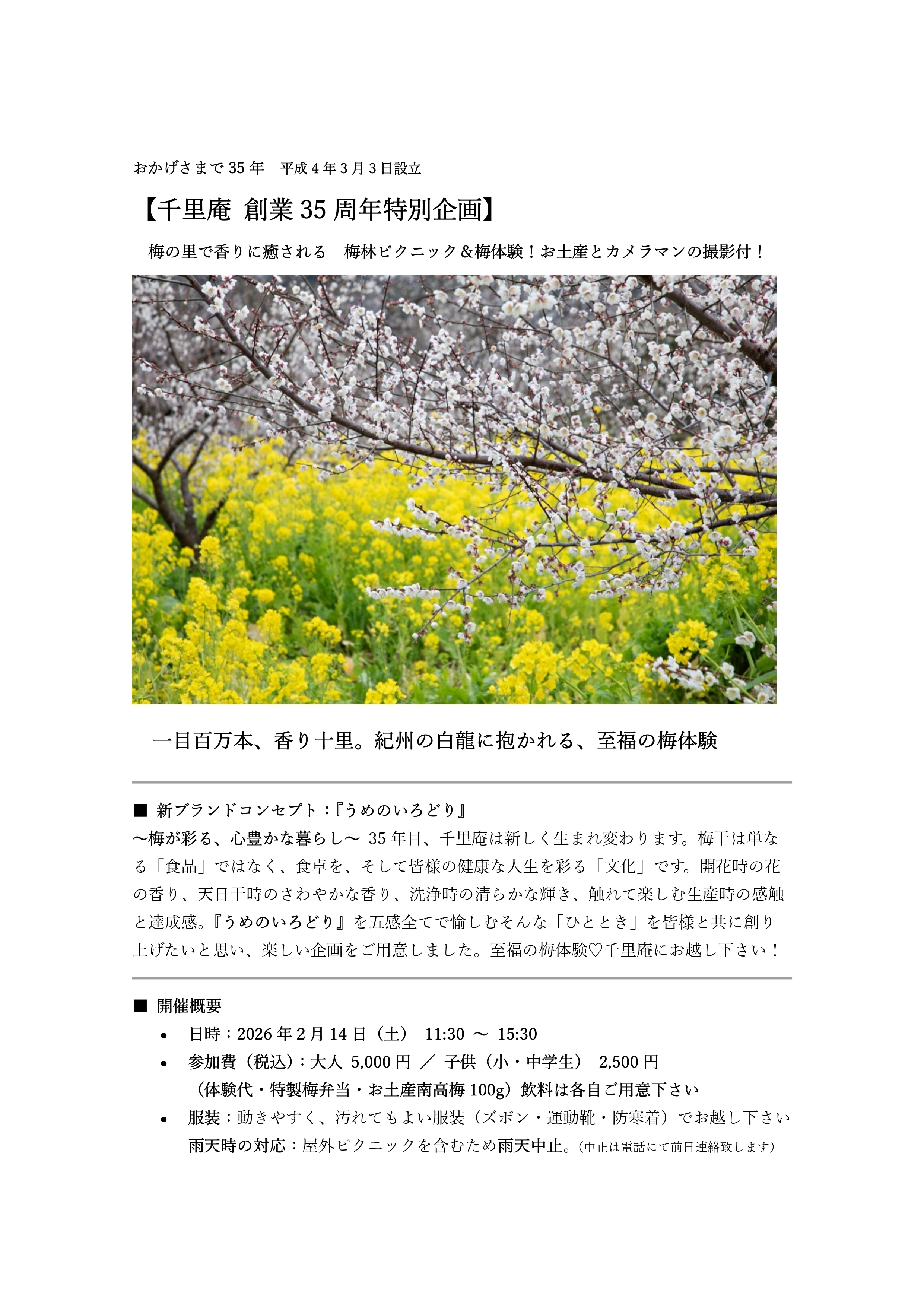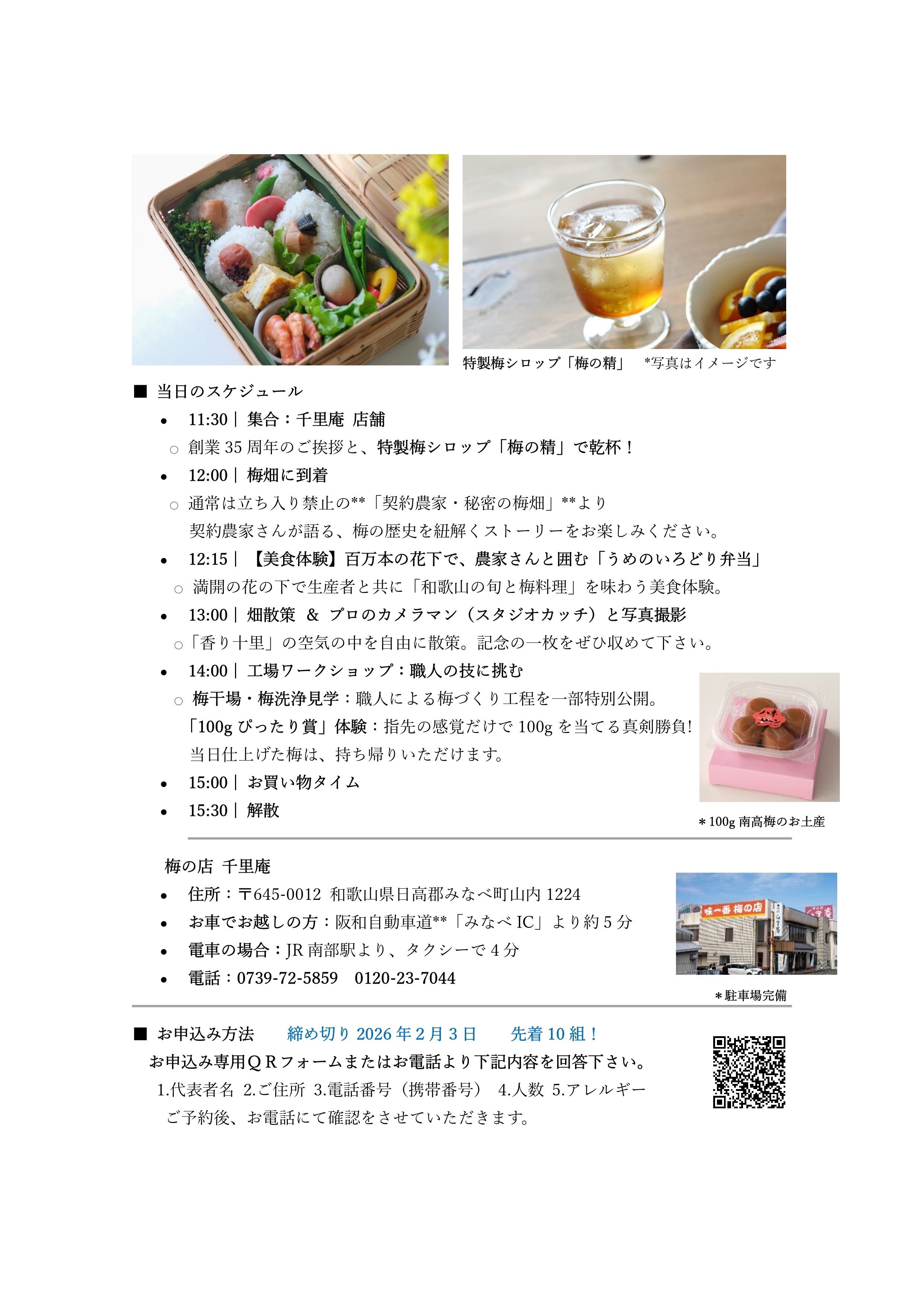 梅の里で香りに癒される「梅林ピクニック&梅体験」を開催します。 通常は立ち入り禁止の“秘密の梅畑”や、うめのいろどり弁当、プロカメラマン撮影、 工場ワークショップまで、五感で楽しむ内容です。